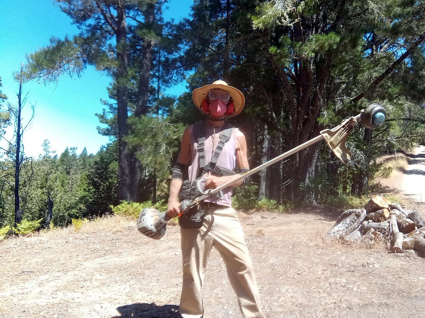 Also, tools of any kind, whether mechanized or not, introduce an element of danger. When using a handheld tool with a sharp edge, you must always be aware of where your other hand is, lest you cut yourself. Any long-handled thing you’re swinging can miss the mark and end up bashing you. I’ve done both, multiple times, this season included. Safe use of a weed-whacker requires long pants and long sleeves, closed-toe shoes, goggles, and ear-protection plus an N95 mask or at least a bandanna for the fumes and dust. Laden with all this, you’ll want to limit such work to the mornings, before it gets hot. With all these tools there is, again, concern about repetitive stress and other muscle injuries, which an experienced person learns to avoid with proper stance, switching sides, and knowing when to quit.